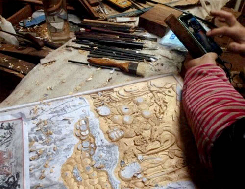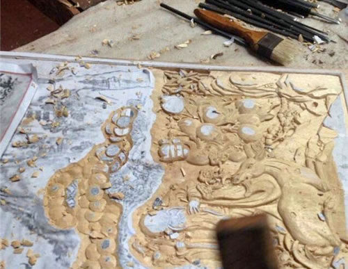 3、使用修光刀對圖案進一步處理,這個過程又叫鏟活兒,主要是將有棱角的地方修平,突出雕刻圖案的線腳,對凹陷進去的部分加以鏟平。